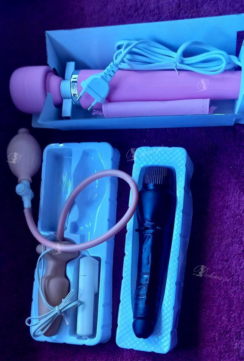 -Posiadam gadżety; strapon, dildo, wibrator, plug analny pompowany, masażer, kajdanki, packa, pejcz, bat język diabła), obroża, smycz, knebel kulkowy i rozwarty, opaska na oczy