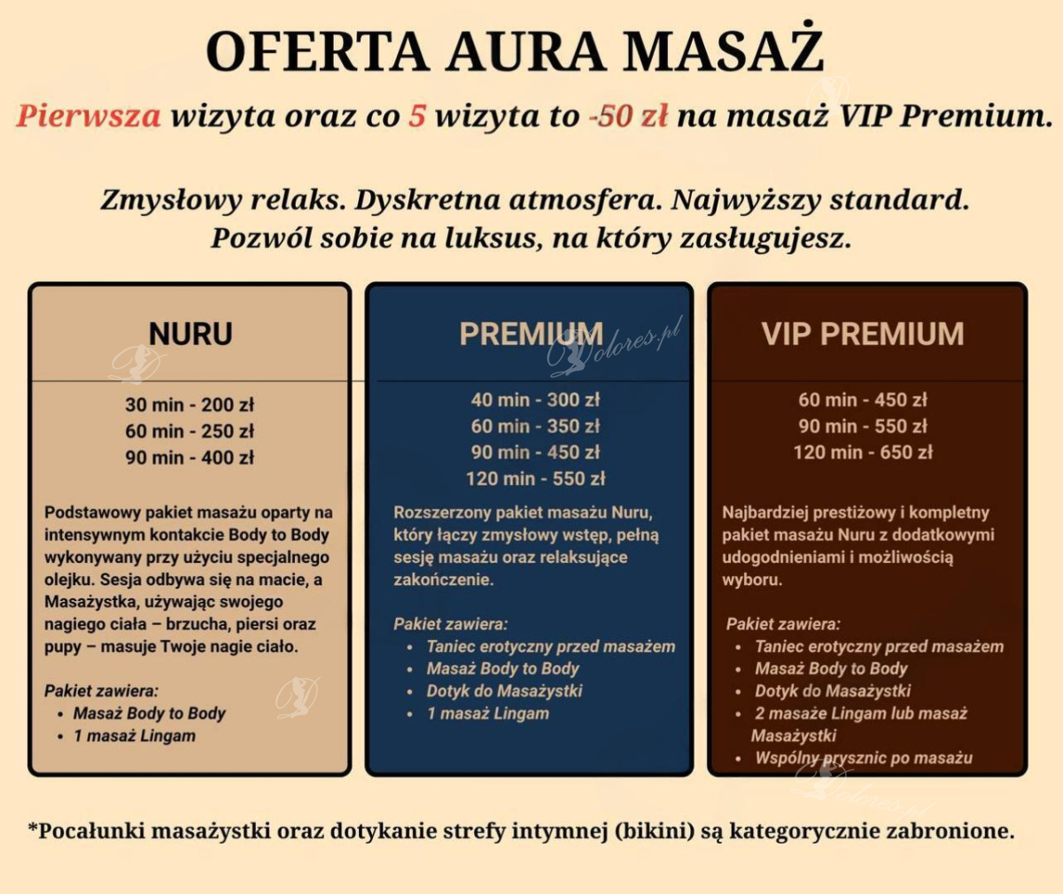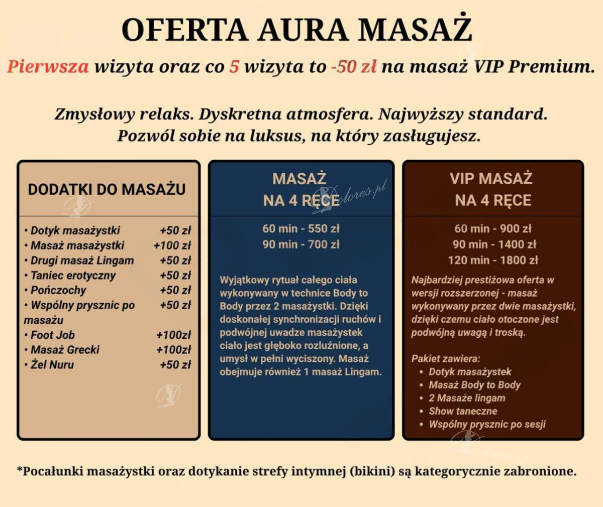 ⛔️ Pocałunki masażystki (w tym pocałunki po ciele) oraz dotykanie stref intymnych (bikini) są kategorycznie zabronione.