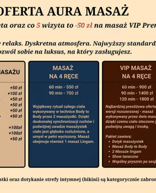 (900 zł / 60 min) - najbardziej prestiżowa oferta naszego salonu Aura Masaż w wersji rozszerzonej - masaż wykonywany przez dwie masażystki, dzięki czemu ciało otoczone jest podwójną uwagą i troską. W cenie pakietu znajdują się liczne udogodnienia, w tym: