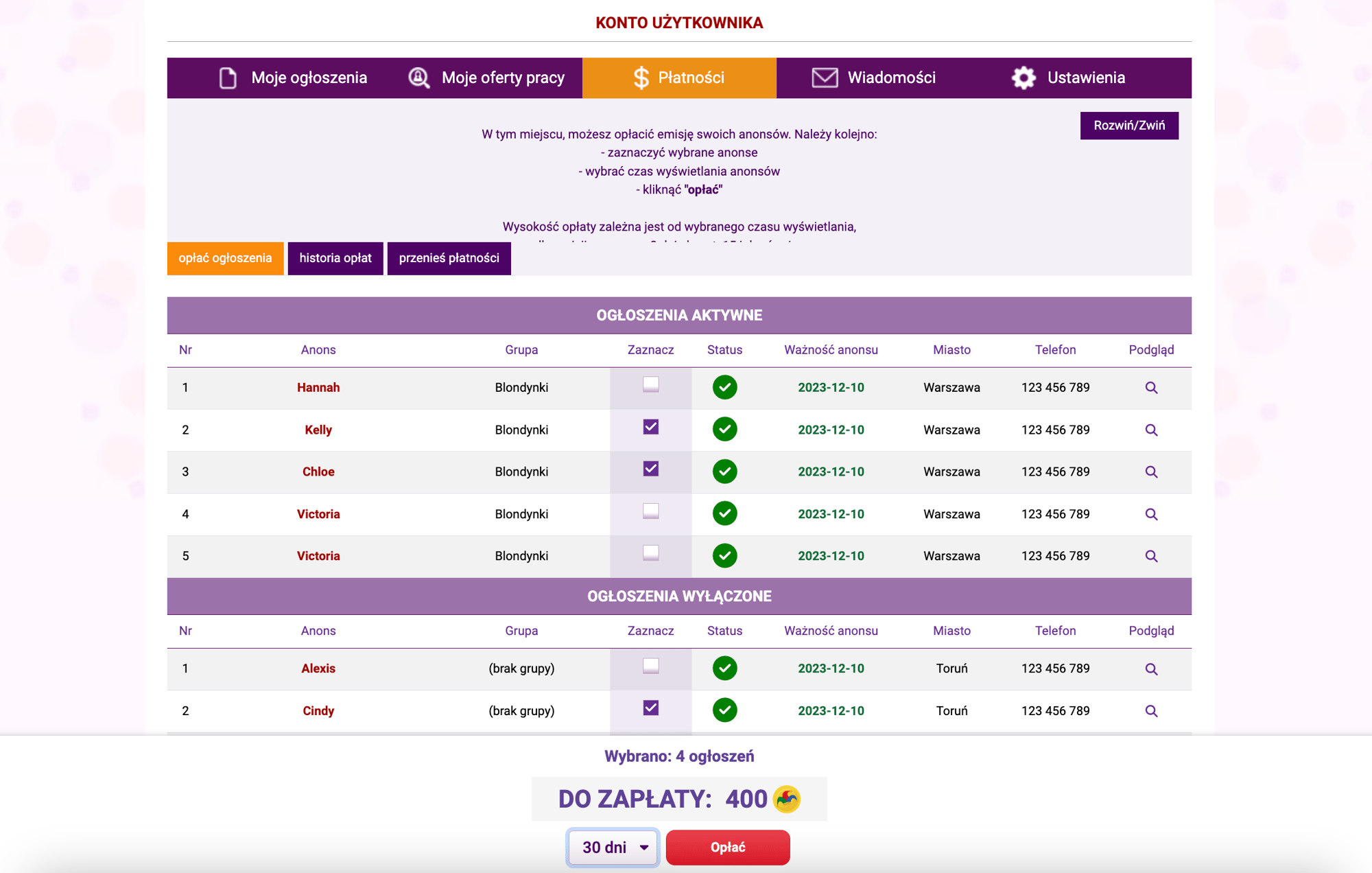 Po przejściu do działu „PŁATNOŚCI” w panelu ogłoszeniodawcy, w sekcji „opłać ogłoszenia” widoczne będą wszystkie Twoje anonse towarzyskie. Podzielone będą na: