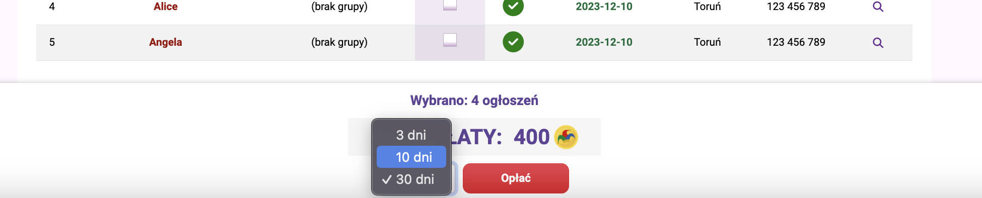 Na początku, zaznaczając w kolumnie „Zaznacz” wybierz te anonse erotyczne, które chcesz by zostały opłacone. Jeżeli zarządzasz dużą ilością anonsów a Twoja lista jest długa, przed wyborem czasu emisji i dokonaniem opłaty, możesz upewnić się czy zaznaczyłeś do opłacenia właściwe anonse towarzyskie, przesuwając kursorem na „lupkę” znajdującą się przy każdym ogłoszeniu po prawej stronie