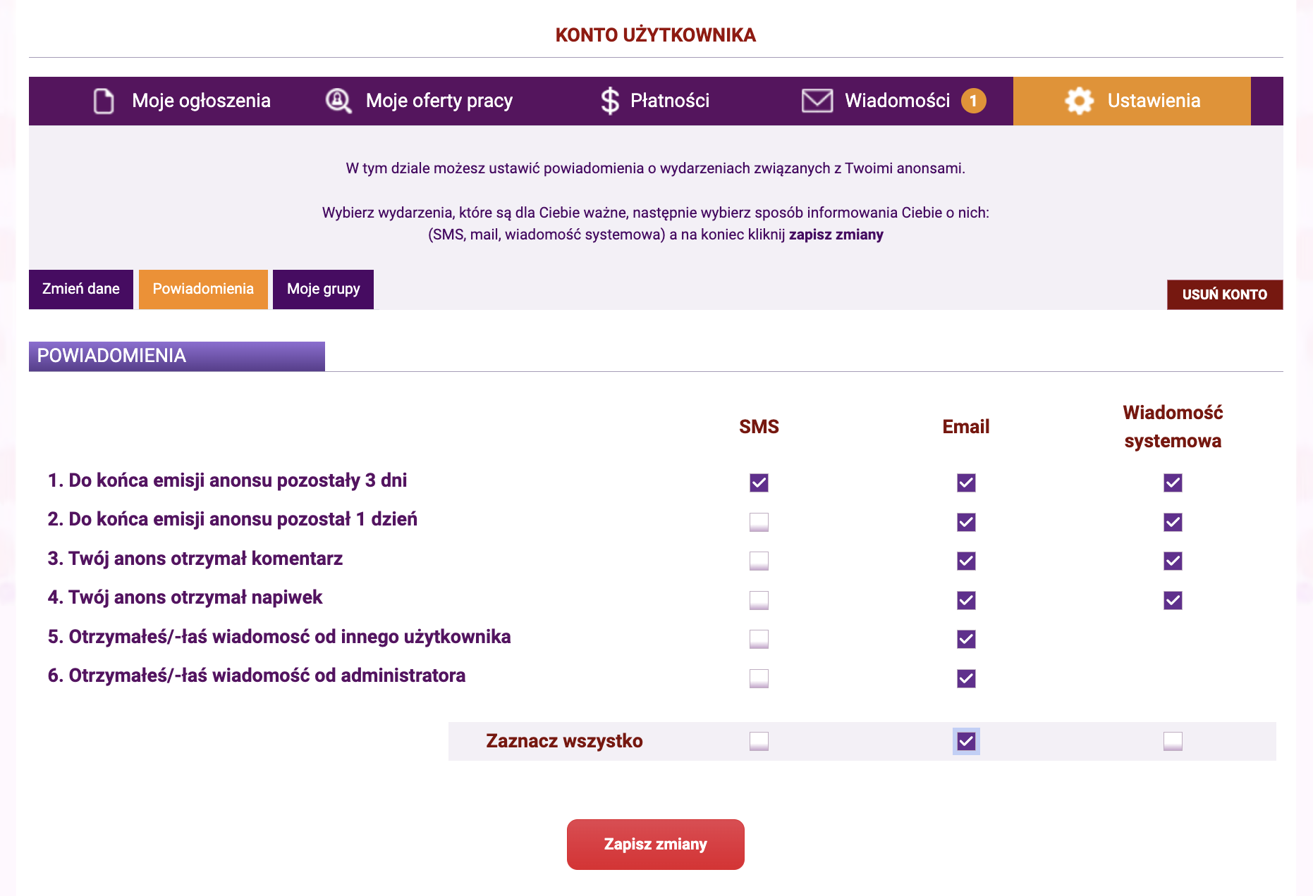Jeżeli chcesz być na bieżąco, ze wszystkim tym co dotyczy Twoich anonsów, możesz ustawić powiadomienia w DZIALE USTAWIENIA, w sekcji „Powiadomienia”